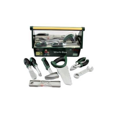 Med en værktøjskasse har dit barn altid et sted at samle sit legetøjs værktøj. Denne kasse er af mærket Bosch og indeholder sav, hammer, fil, tang og mere.