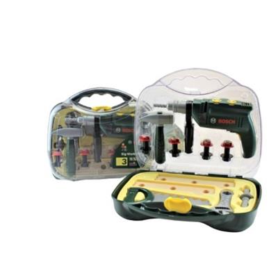 Med en værktøjsæske har dit barn altid et sted at samle sit legetøjs værktøj. Denne kasse er af mærket Bosch og indeholder boremaksine, hammer, sav, svensknøgle, skruer m.m.
