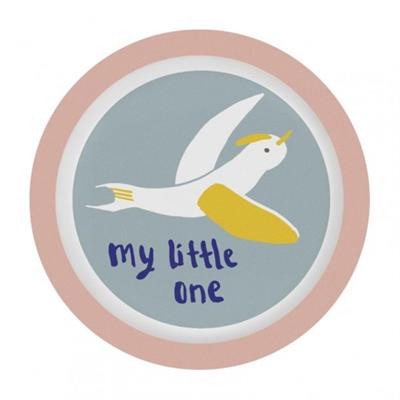 Tallerkenen er med lyserøde sider og med fint motiv af en fugl i bunden, der vil gøre det lidt sjovere for barnet at spise op.