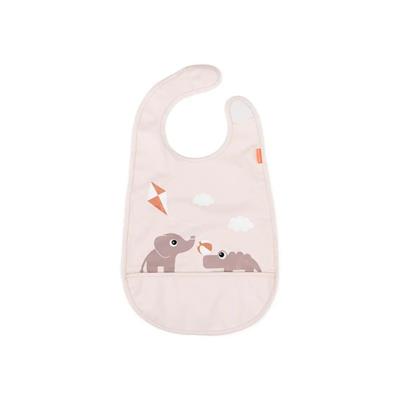 Hagesmækken er med smart velcro lukning og en opsamler til madrester. På hagesmækken er den søde elefant og krokodille, der er en del af Done By Deer Playground.