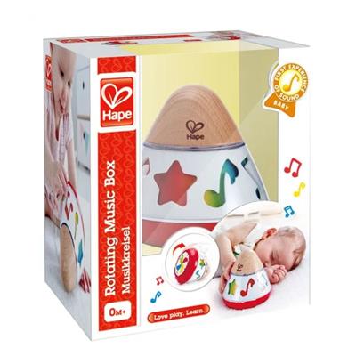 Beroligende melodier og legende bevægelser i ét Hape Rotating Music Box er perfekt til de helt små. Drej bunden for at aktivere den blide musik, og lad boksen snurre enten stående eller liggende. Som den drejer, skifter farverige musik-symboler farve og glider i cirkulære bevægelser, hvilket fanger barnets opmærksomhed. Designet i bæredygtigt træ med en rolig æstetik, som passer smukt i børneværelset både som legetøj og stimulator for sanserne og hånd-øje-koordinationen. Boksens rolige melodi spiller op til 2½ minut, når mekanismen er optrukket.