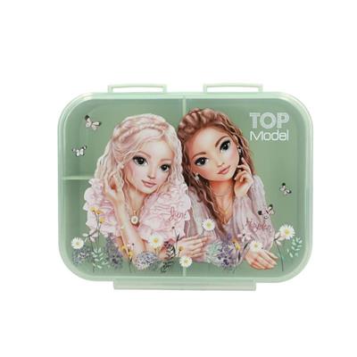 Denne salviegrønne madkasse er smukt dekoreret med filigranblomster, delikate sommerfugle og ikoniske TOPModel-figurer på både låget og siderne.